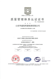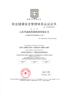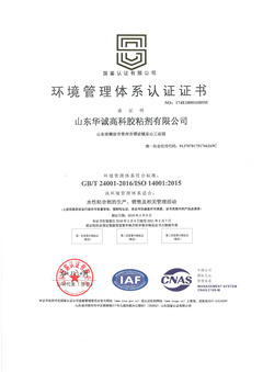 山東華誠高科膠粘劑有限公司于2018年2月8日經過山東國鑒認證有限公司認真嚴格的多次論證、檢查、考核,全面通過ISO9001:2015質量管理體系認證、ISO14001:2015環境管理體系認證、OHSAS18001:2007職業健康安全管理體系認證。