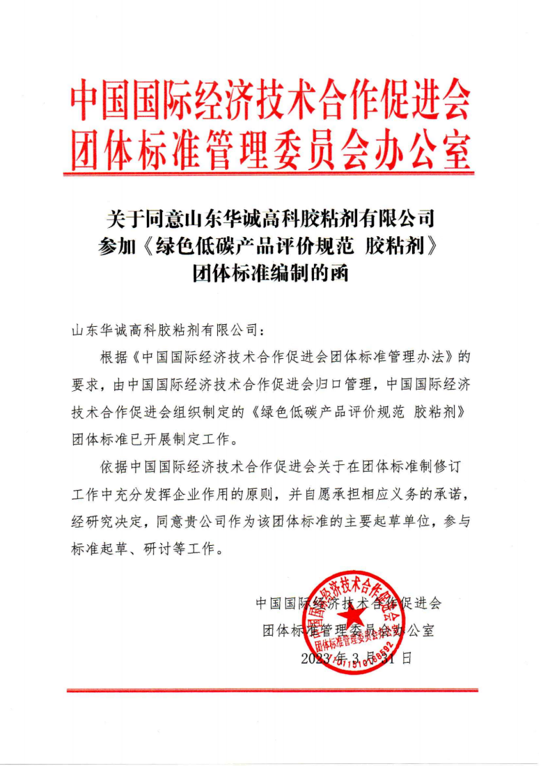 近日,山東華誠高科膠粘劑有限公司參編《膠粘劑制造行業綠色工廠評價規范》、《綠色低碳產品評價規范 膠粘劑》兩項團體標準。